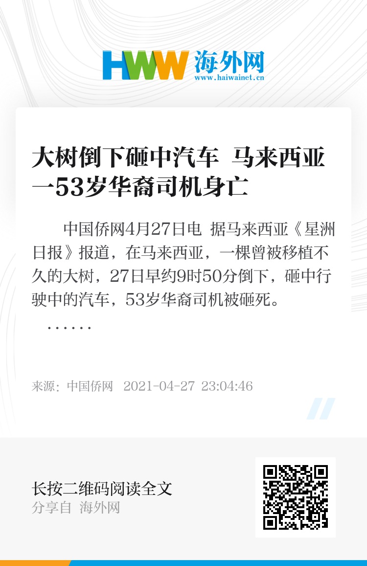 中国侨网4月27日电 据马来西亚《星洲日报》报道,在马来西亚,一棵曾被移植不久的大树,27日早约9时50分倒下,砸中行驶中的汽车,53岁华裔司机被砸死。