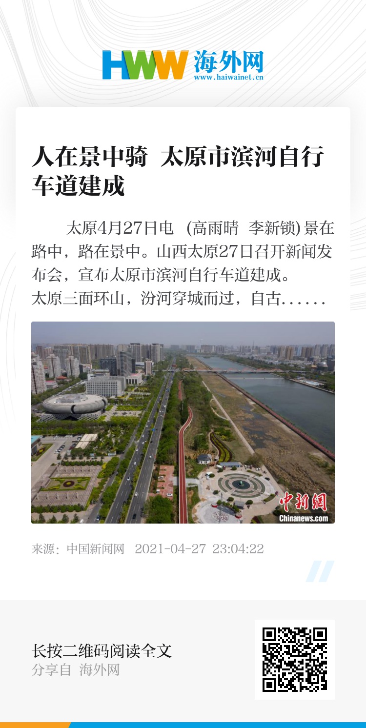 中新网太原4月27日电 (高雨晴 李新锁)景在路中,路在景中。山西太原27日召开新闻发布会,宣布太原市滨河自行车道建成。