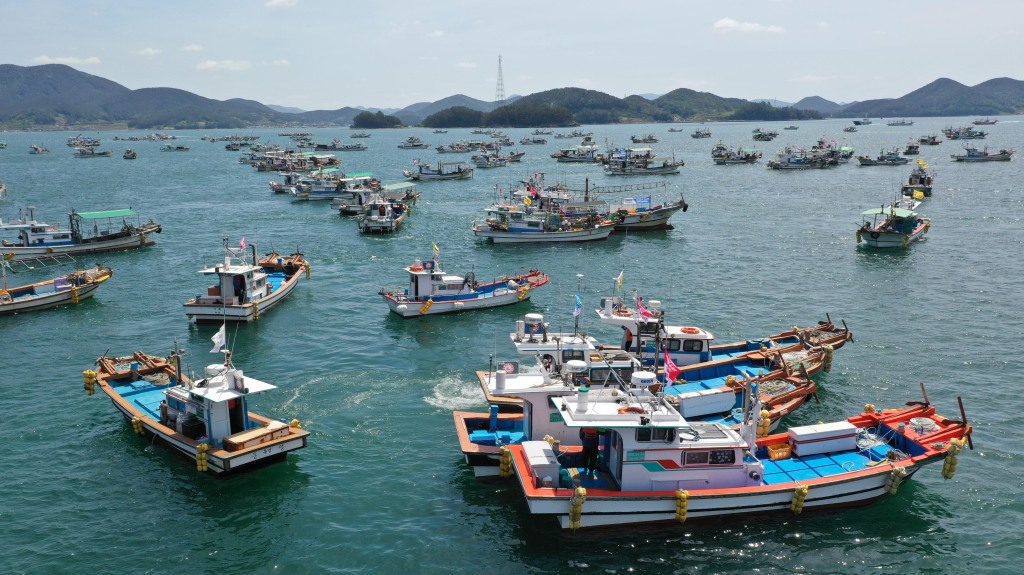 当地时间2021年4月26日,韩国庆尚南道统营市的李舜臣公园前海域,200艘渔船组队示威,谴责日本决定将福岛核电站污水排入大海。图片来源:澎湃影像