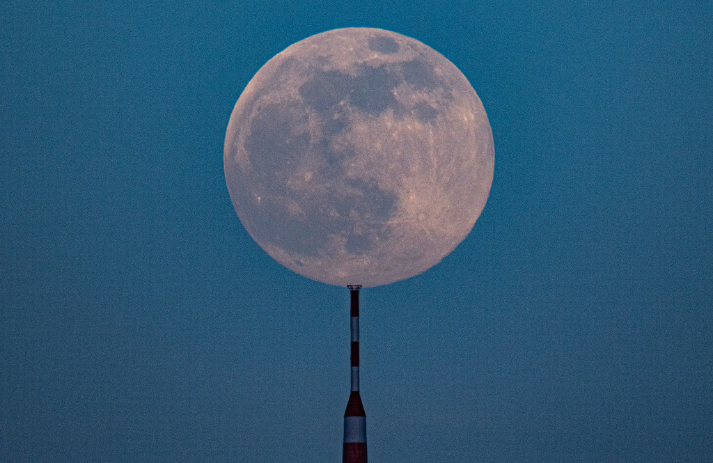 当地时间2021年4月26日,德国法兰克福,夜空现“超级粉红月亮”奇景。图片来源:IC photo