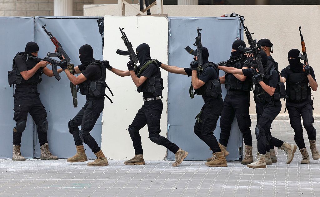 当地时间2021年4月26日,加沙地带举行警察毕业典礼,警察们展示多种技巧。图片来源:视觉中国