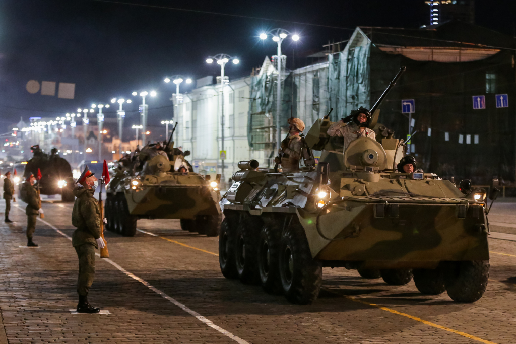 当地时间2021年4月26日,俄罗斯叶卡捷琳堡,俄罗斯举行胜利日阅兵式首次夜间联合彩排。据悉,一年一度的俄罗斯红场阅兵将于5月9日举行。图源:澎湃影像