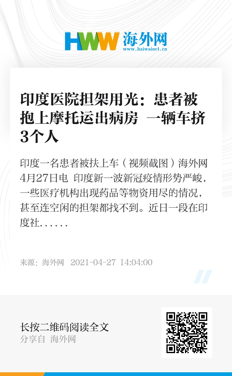 海外网4月27日电 印度新一波新冠疫情形势严峻,一些医疗机构出现药品等物资用尽的情况,甚至连空闲的担架都找不到。近日一段在印度社交媒体上流传的视频就显示,一位患者不是被担架,而是被摩托车运出病房。