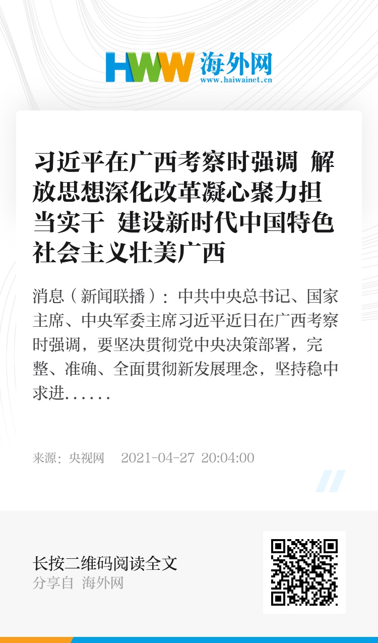 4月25日至27日,习近平在广西壮族自治区党委书记鹿心社和自治区政府主席蓝天立陪同下,先后来到桂林、柳州、南宁等地,深入革命纪念馆、农村、企业、民族博物馆等,就贯彻党的十九届五中全会精神、开展党史学习教育、推动“十四五”开好局起好步等进行调研。
