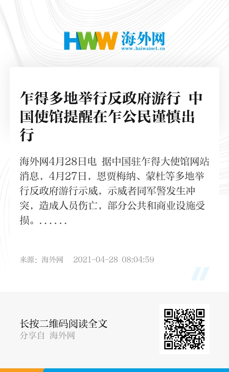 海外网4月28日电 据中国驻乍得大使馆网站消息,4月27日,恩贾梅纳、蒙杜等多地举行反政府游行示威,示威者同军警发生冲突,造成人员伤亡,部分公共和商业设施受损。据悉,近期很可能发生新的反政府游行示威。