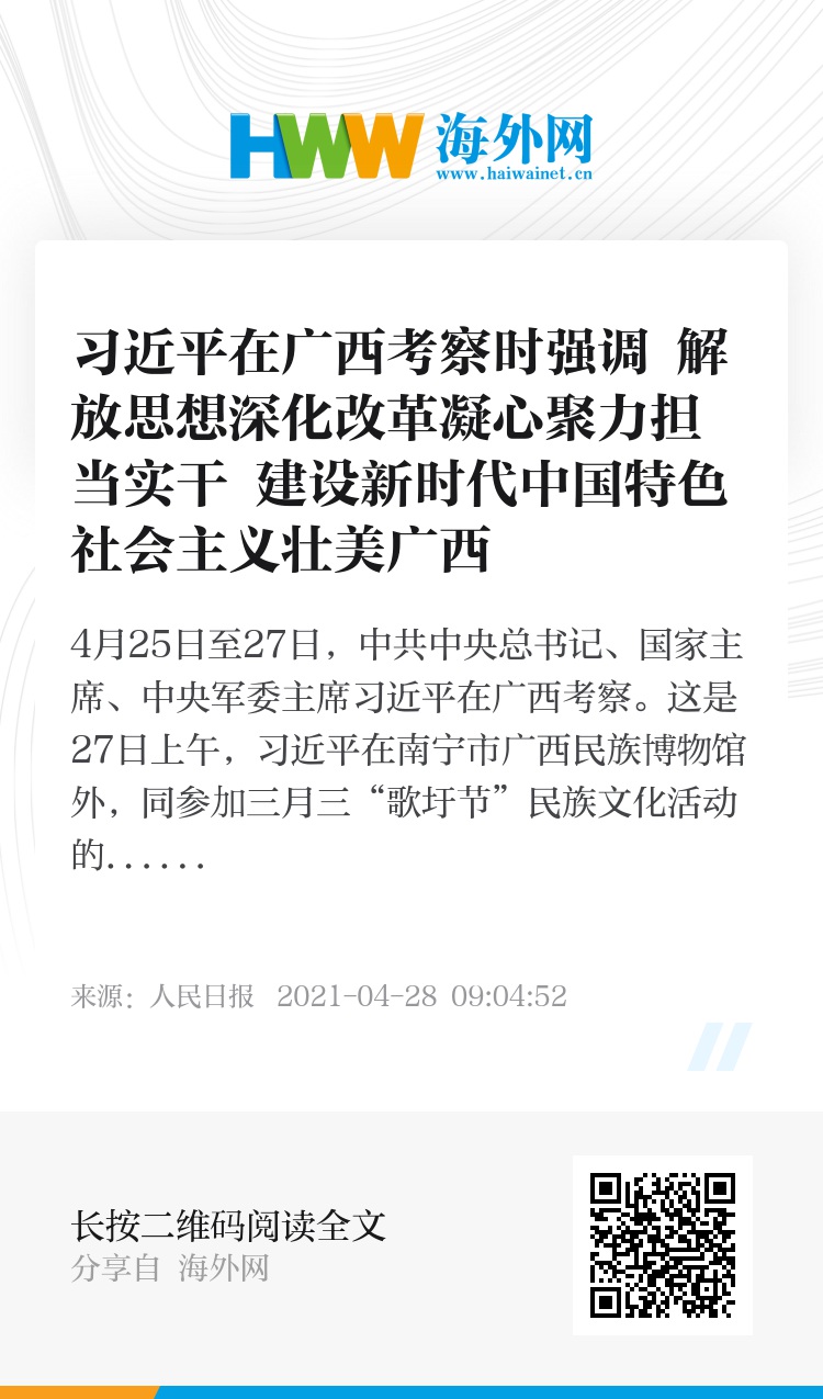 4月25日至27日,习近平在广西壮族自治区党委书记鹿心社和自治区政府主席蓝天立陪同下,先后来到桂林、柳州、南宁等地,深入革命纪念馆、农村、企业、民族博物馆等,就贯彻党的十九届五中全会精神、开展党史学习教育、推动“十四五”开好局起好步等进行调研。