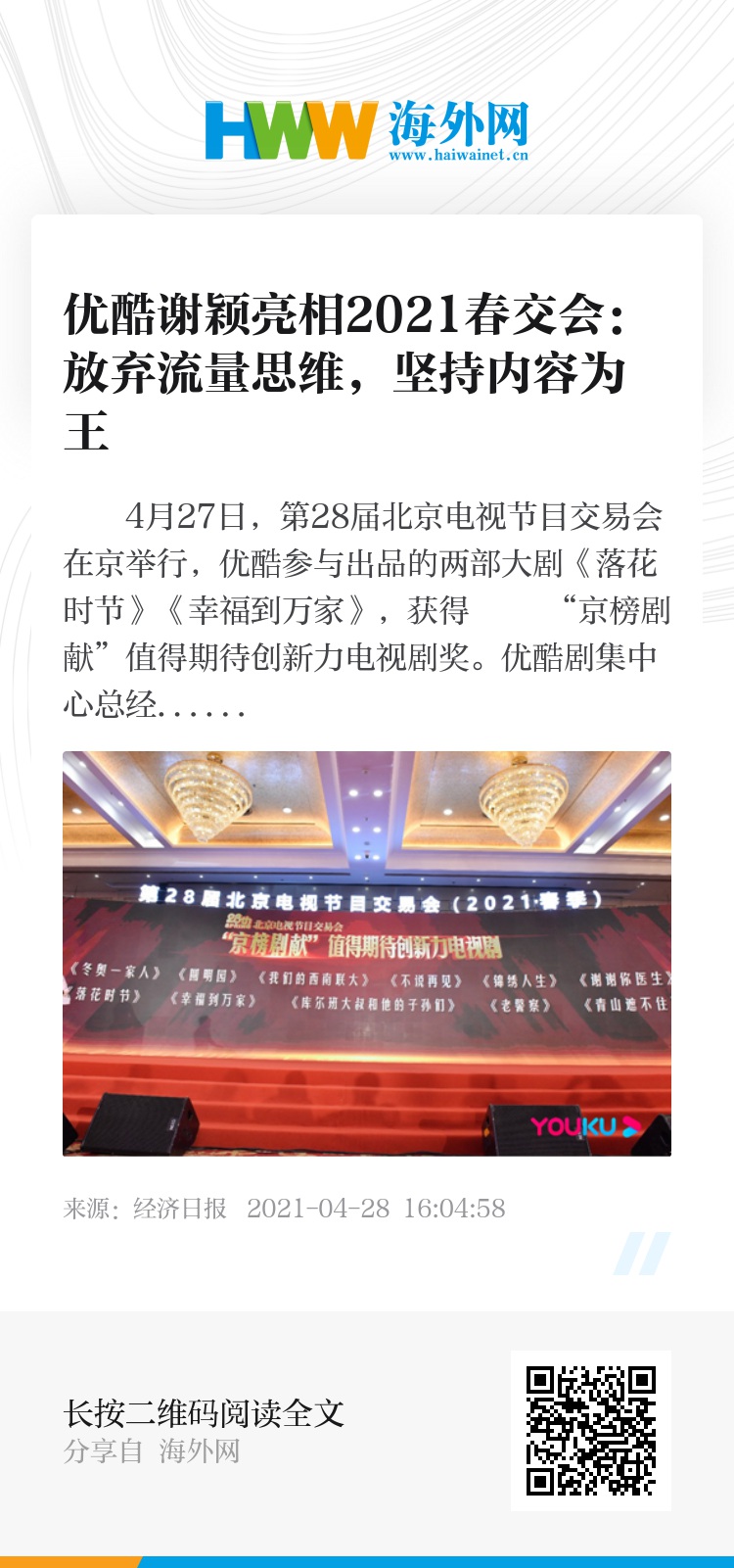 4月27日,第28届北京电视节目交易会在京举行,优酷参与出品的两部大剧《落花时节》《幸福到万家》,获得 “京榜剧献”值得期待创新力电视剧奖。优酷剧集中心总经理谢颖在会上发表演讲,她认为这一成绩,得益于优酷“放弃流量思维,坚信内容为王”的制作思路。2021年Q1优酷推出《乡村爱情13》《山河令》《司藤》《巡回检察组》四部爆款,实现了全网日活跃用户增速第一。