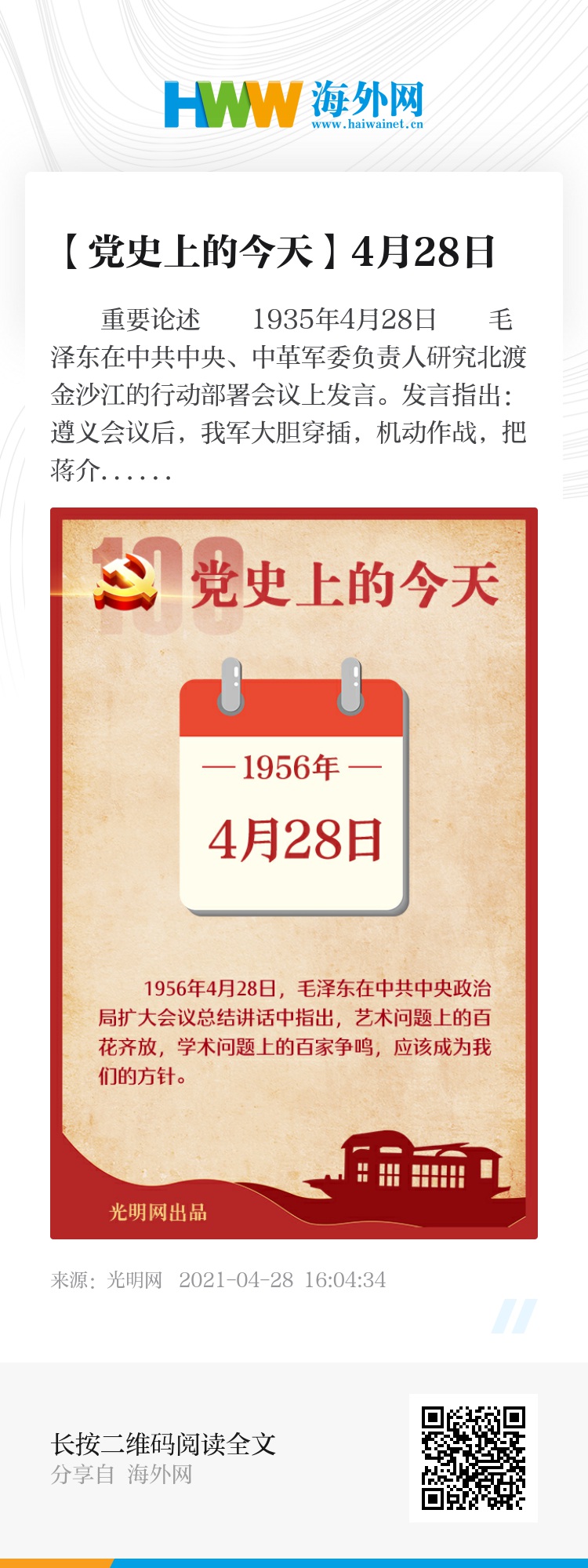 4月28日 毛泽东在中共中央政治局扩大会议总结讲话中指出,艺术问题上的百花齐放,学术问题上的百家争鸣,应该成为我们的方针。5月2日,毛泽东在最高国务会议第七次会议上正式提出“百花齐放、百家争鸣”的方针。