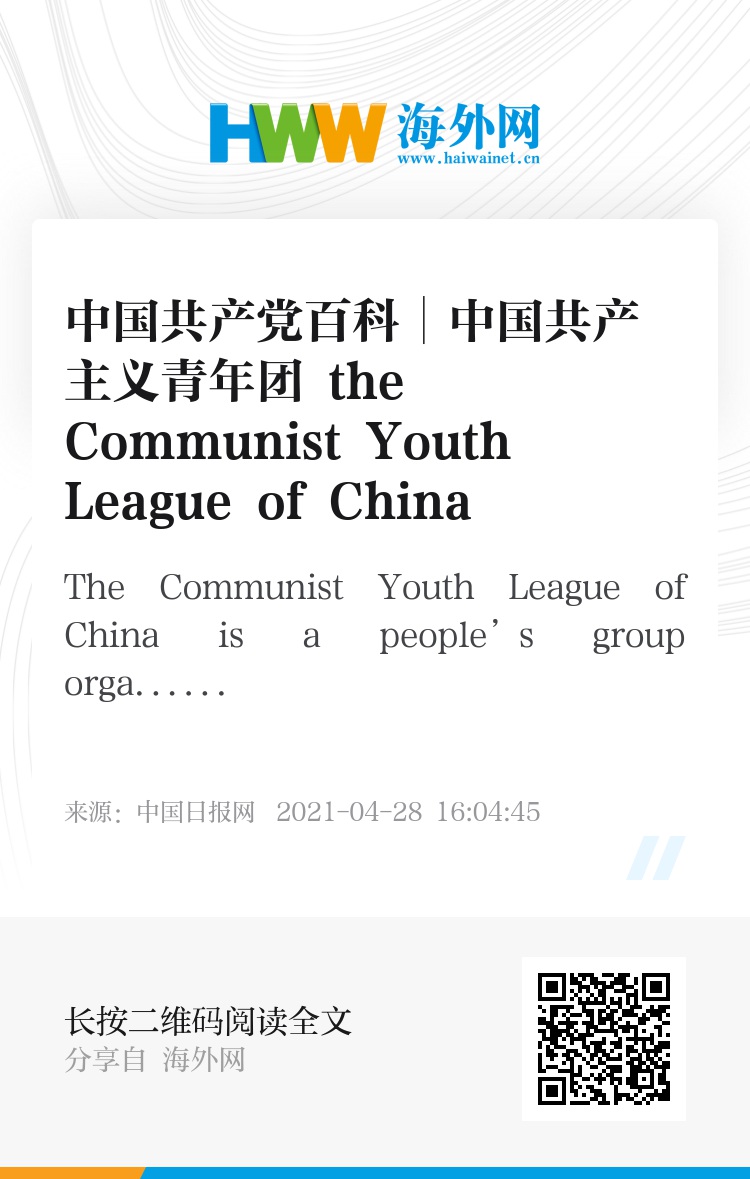 The Communist Youth League of China is a people’s group organization of forward-thinking young people under the leadership of the Communist Party of China; it is a school for vast numbers of young people to learn through practice about socialism with Chinese characteristics and about communism; it is an aide to and reserve force of the Party. The Central Committee of the Communist Youth League functions under the leadership of the Central Committee of the Party. Local chapters of the Communist Youth League come under the leadership of the relevant Party committee at the corresponding level and of the higher-level organization of the League itself.