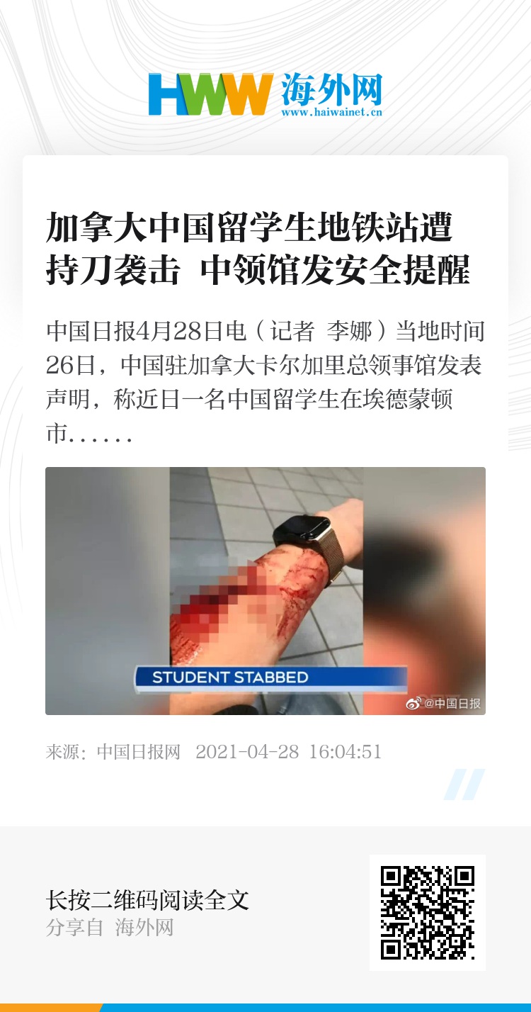 中国日报4月28日电(记者 李娜)当地时间26日,中国驻加拿大卡尔加里总领事馆发表声明,称近日一名中国留学生在埃德蒙顿市地铁站被歹徒持刀刺伤,提醒中国公民重视人身安全。