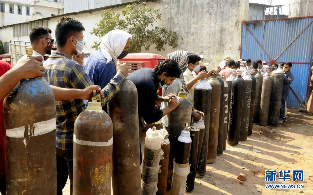 4月27日,人们在印度巴特那等待为氧气罐充氧。近期,印度新冠疫情急剧恶化。印度卫生部27日公布的数据显示,该国已连续6天单日新增病例超30万例,累计确诊超1763万例;新增死亡2771例,累计死亡197894例。由于患者数量增长过快,印度多地重症病床、氧气和药品等医疗资源告急。新华社发