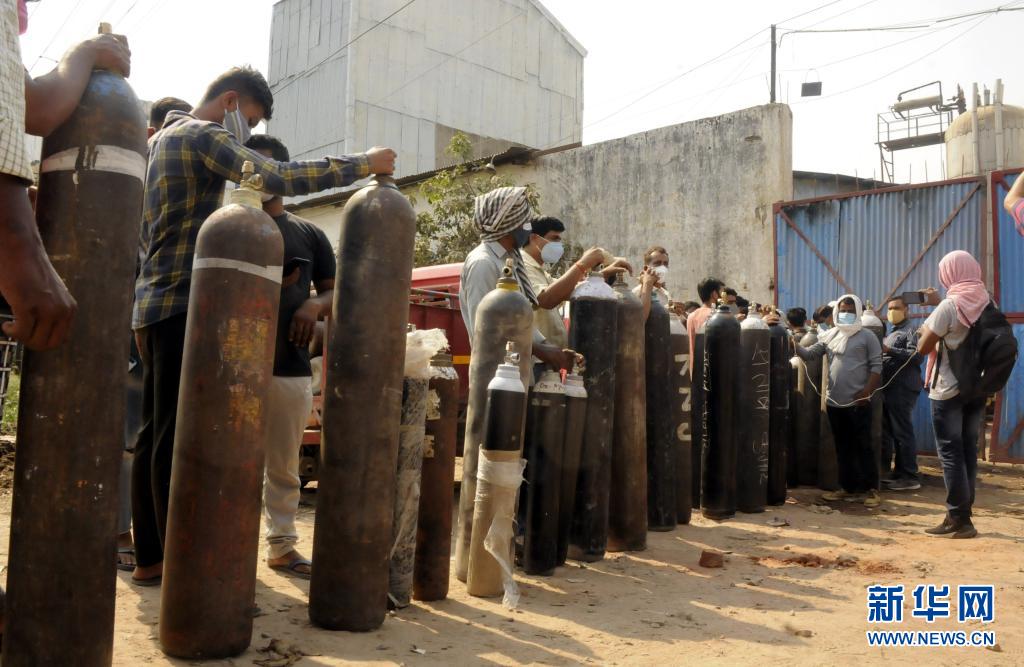 4月27日,人们在印度巴特那等待为氧气罐充氧。近期,印度新冠疫情急剧恶化。印度卫生部27日公布的数据显示,该国已连续6天单日新增病例超30万例,累计确诊超1763万例;新增死亡2771例,累计死亡197894例。由于患者数量增长过快,印度多地重症病床、氧气和药品等医疗资源告急。新华社发