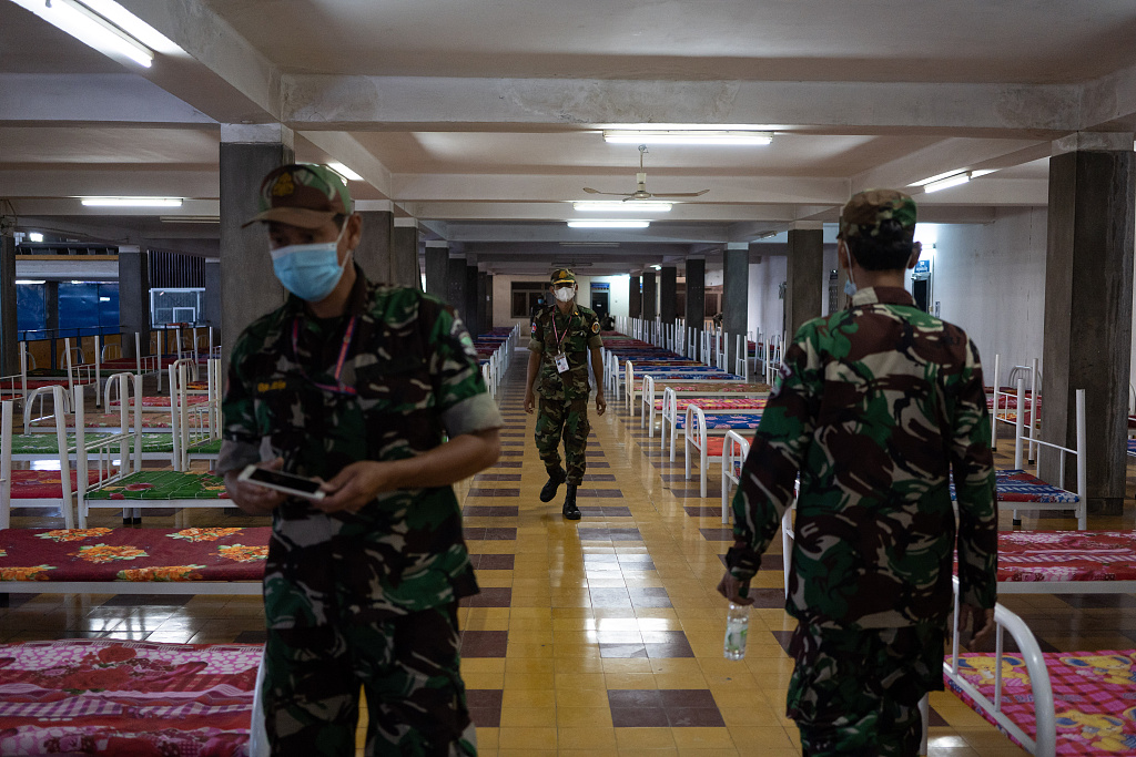 当地时间2021年4月26日,柬埔寨金边,军队士兵在奥林匹克体育场建立应对新冠疫情的临时医院。图片来源:人民视觉