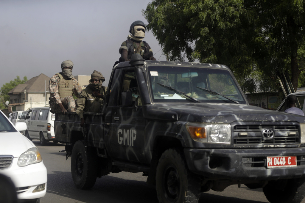 当地时间2021年4月27日,乍得恩贾梅纳,当地举行反政府游行示威,示威者同军警发生冲突。图为警察在街头巡逻。图片来源:澎湃影像