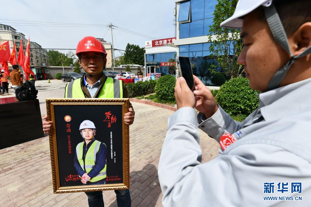 4月28日,劳动者与自己的微笑照片合影。当日,由北京市总工会主办的“首都劳动者微笑迎‘五一’暨创新实干勇争先劳动竞赛”,在北京建工集团地铁歇甲村车辆段项目部举行,参与北京市轨道交通建设的劳动者获赠自己的微笑照片,迎接属于自己的节日。新华社记者 金良快 摄