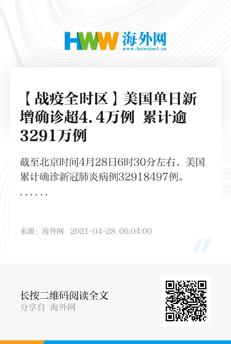 海外网4月28日电 根据Worldometer实时统计数据,截至北京时间4月28日6时30分左右,美国累计确诊新冠肺炎病例32918497例,累计死亡病例587276例。与前一日6时30分数据相比,美国新增确诊病例44317例,新增死亡病例745例。(海外网 朱惠悦)