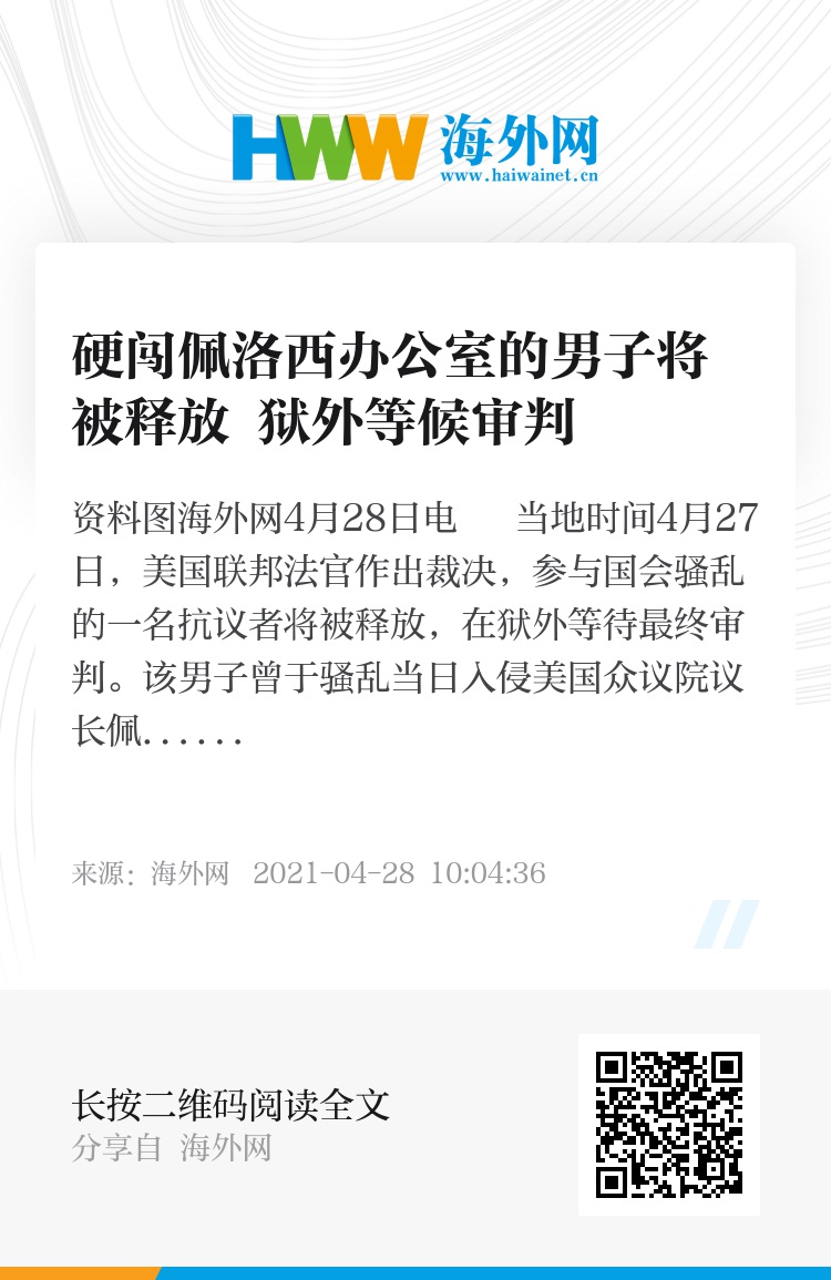 海外网4月28日电 当地时间4月27日,美国联邦法官作出裁决,参与国会骚乱的一名抗议者将被释放,在狱外等待最终审判。该男子曾于骚乱当日入侵美国众议院议长佩洛西的办公室。