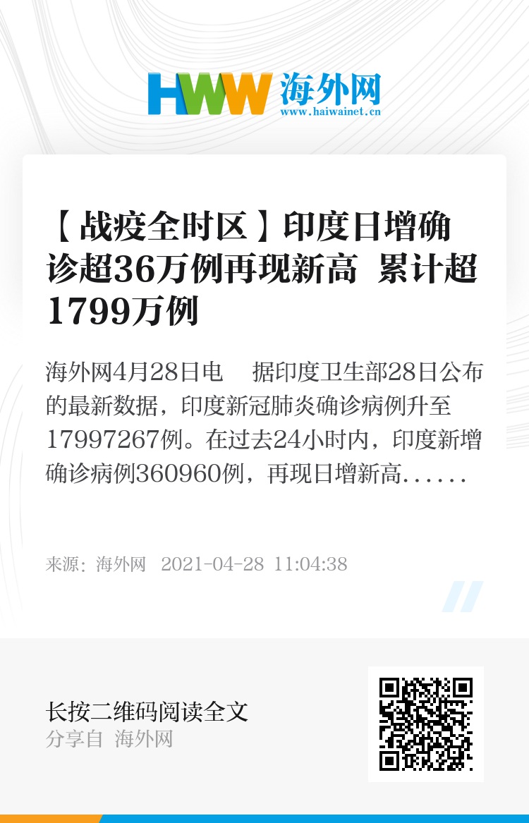 海外网4月28日电 据印度卫生部28日公布的最新数据,印度新冠肺炎确诊病例升至17997267例。在过去24小时内,印度新增确诊病例360960例,再现日增新高,连续7天单日新增超30万例;新增死亡病例3293例,累计死亡201187例。(海外网 赵健行)
