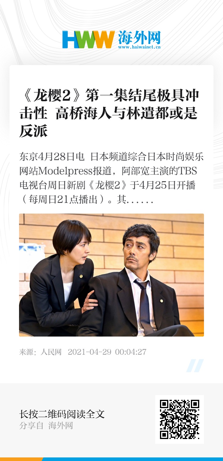 人民网东京4月28日电 日本频道综合日本时尚娱乐网站Modelpress报道,阿部宽主演的TBS电视台周日新剧《龙樱2》于4月25日开播(每周日21点播出)。其第一集的故事情节就极具冲击性,引发热议。