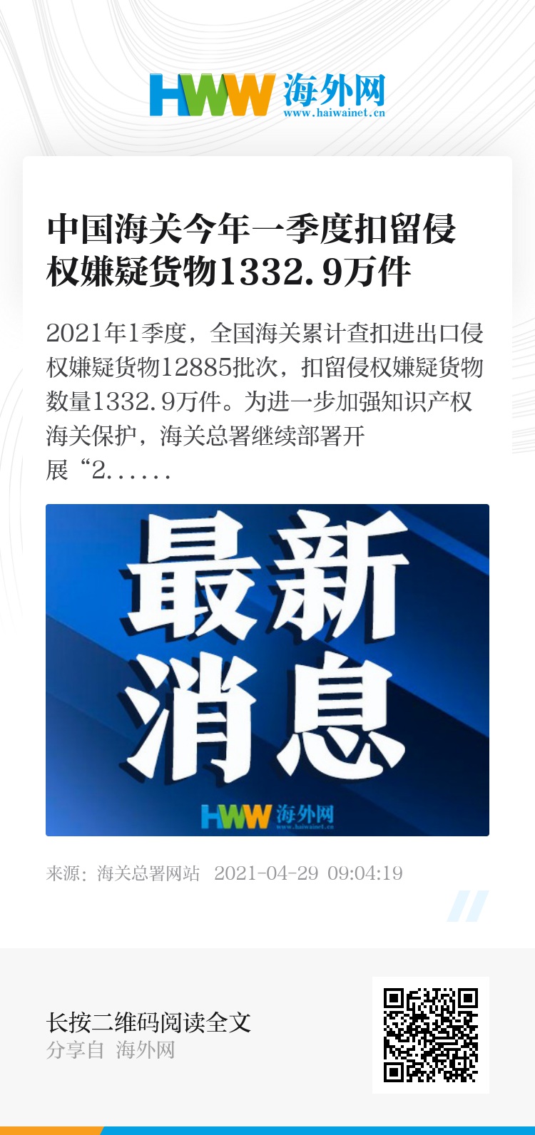 2021年1季度,全国海关累计查扣进出口侵权嫌疑货物12885批次,扣留侵权嫌疑货物数量1332.9万件。