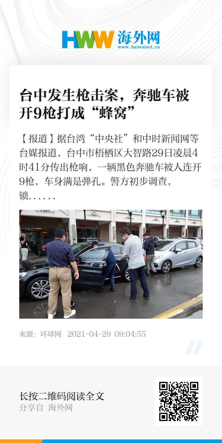 据台湾“中央社”报道,台中市清水警分局安宁派出所29日凌晨4时41分接获民众报案,疑似听见枪响,警方赶到现场,在梧栖区大智路旁发现一辆黑色奔驰车,车身满是弹孔,鉴识小组鉴定遭开9枪。