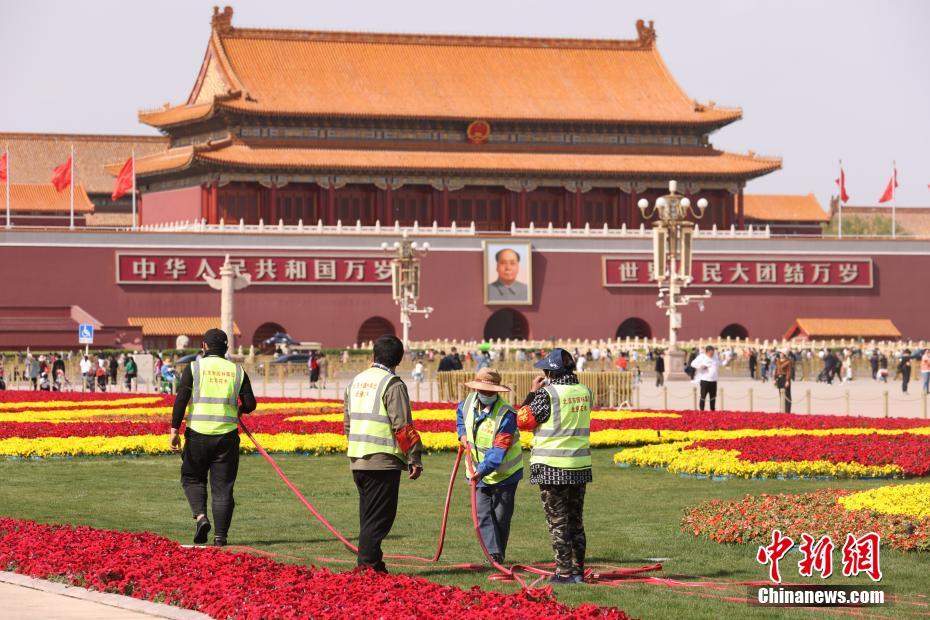 4月28日,北京天安门广场上布置的花坛。“五一”假期临近,北京天安门广场装扮一新。中新社记者 蒋启明 摄