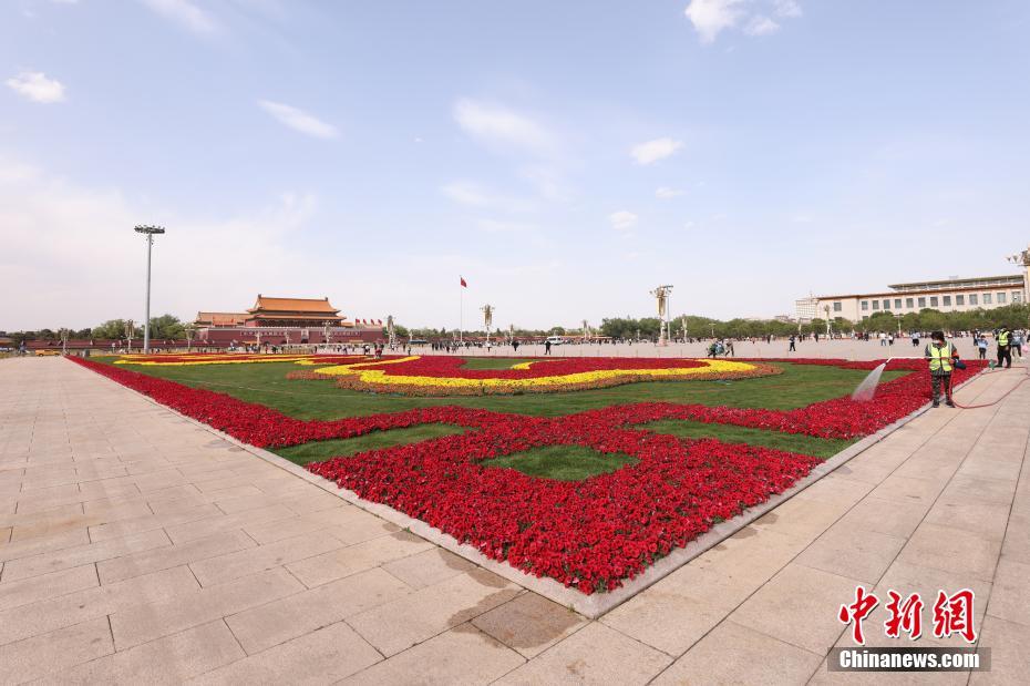 4月28日,北京天安门广场上布置的花坛。“五一”假期临近,北京天安门广场装扮一新。中新社记者 蒋启明 摄