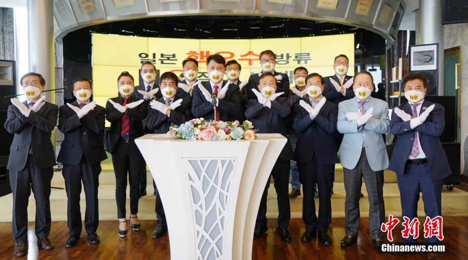 4月28日,中国在韩侨民协会总会、汉城华侨协会、韩国中华总商会等中韩12个民间团体于首尔发表联合声明,抗议日本核废水排放入海。中新社记者 曾鼐 摄