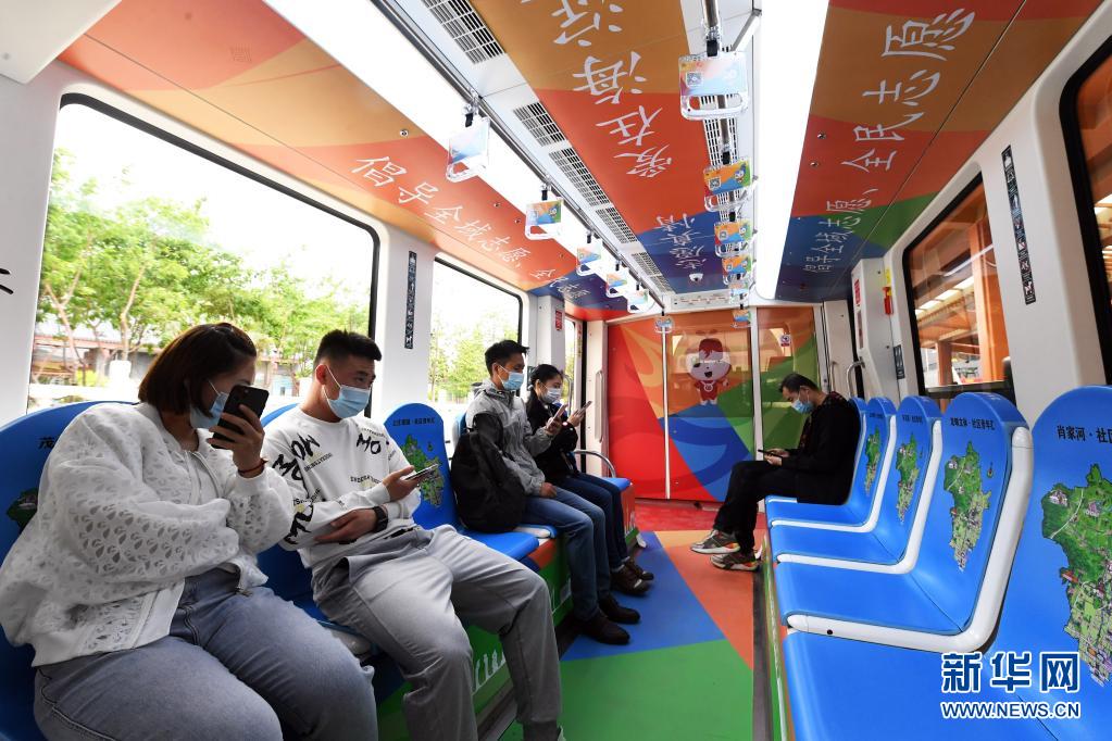 4月29日,乘客乘坐“青春心向党”主题列车。当日,北京有轨电车西郊线定制“青春心向党”主题列车在位于北京市海淀区的巴沟站发车。该主题列车主体为红色,车身两侧配有“建党百年正青春 跟党奋进新时代”的标语,车内主色调为红黄蓝绿拼色,配以志愿服务等形象标识。新华社记者 任超 摄