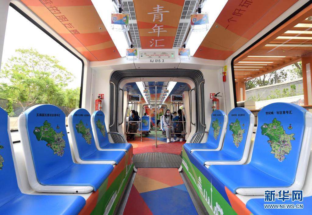 4月29日,乘客乘坐“青春心向党”主题列车。当日,北京有轨电车西郊线定制“青春心向党”主题列车在位于北京市海淀区的巴沟站发车。该主题列车主体为红色,车身两侧配有“建党百年正青春 跟党奋进新时代”的标语,车内主色调为红黄蓝绿拼色,配以志愿服务等形象标识。新华社记者 任超 摄