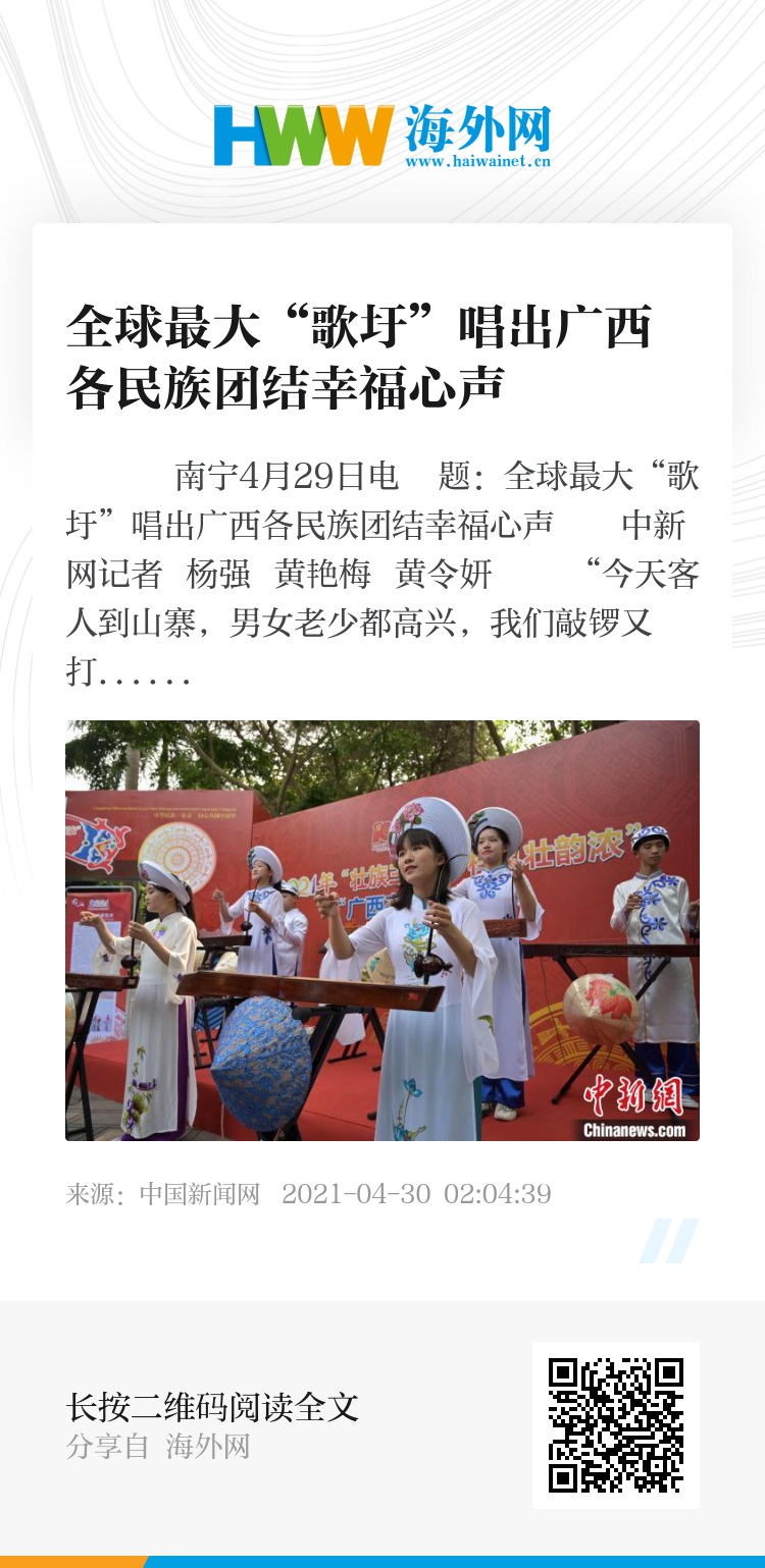 中新网南宁4月29日电 题:全球最大“歌圩”唱出广西各民族团结幸福心声