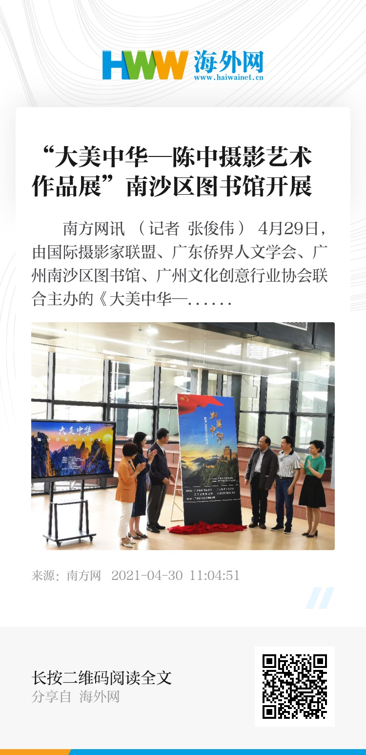 南方网讯 (记者 张俊伟) 4月29日,由国际摄影家联盟、广东侨界人文学会、广州南沙区图书馆、广州文化创意行业协会联合主办的《大美中华——陈中摄影艺术作品展》在广州南沙区图书馆展出。南沙区委相关领导、众多摄影家及摄影爱好者参加了开幕仪式。