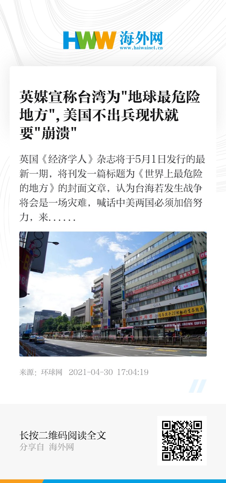 英国《经济学人》杂志将于5月1日发行的最新一期,将刊发一篇标题为《世界上最危险的地方》的封面文章,认为台海若发生战争将会是一场灾难,喊话中美两国必须加倍努力,来避免这种情况的发生。