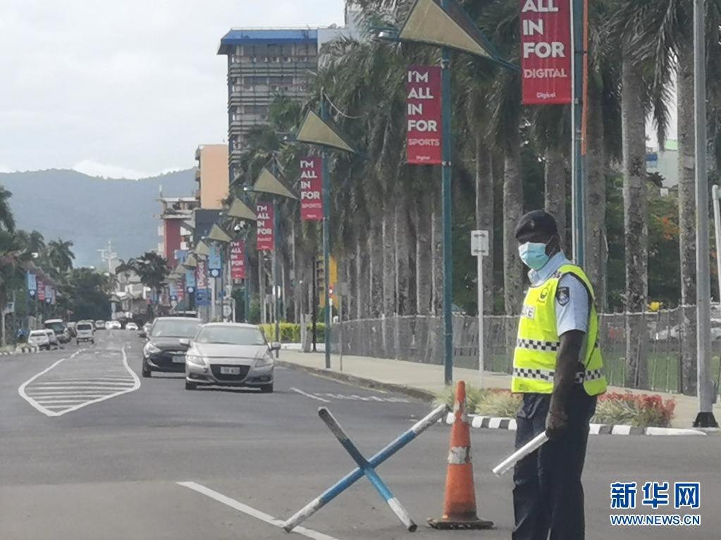 斐济连日来新冠疫情持续恶化,为进一步查清传染源头、遏制疫情传播,斐济政府25日宣布首都苏瓦及周边地区从26日凌晨4时开始实施为期14天的全面封锁。4月29日,一名警察在斐济苏瓦市大街上准备检查过往车辆。新华社记者 张永兴 摄