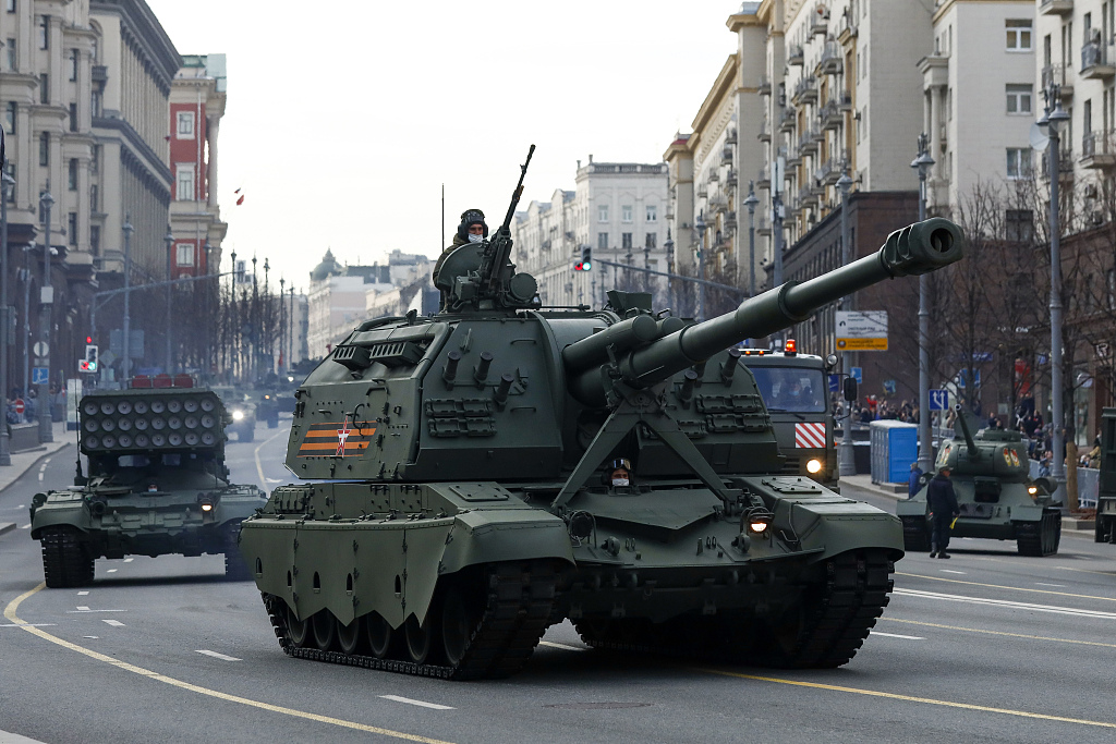 当地时间2021年4月29日,俄罗斯莫斯科,俄罗斯士兵持续进行胜利日阅兵式彩排。阅兵式将于5月9日在莫斯科红场正式举行。图源:人民视觉