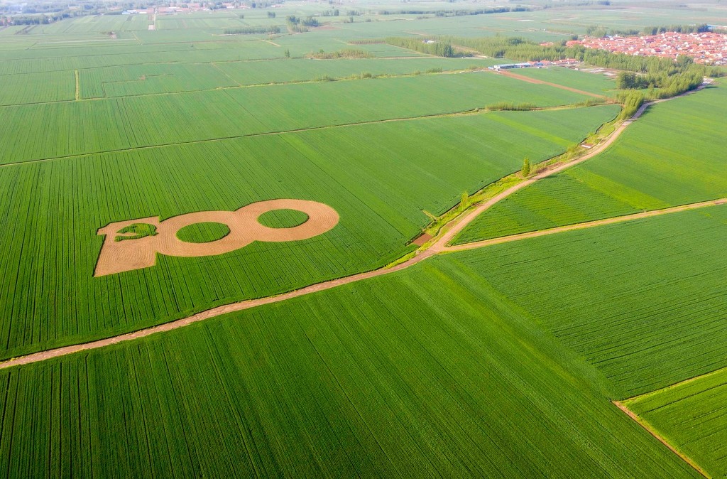2021年4月29日,山东青岛西海岸新区六汪镇的万亩高产小麦田里,绿色葱郁的小麦镌刻出的党徽标识和肥沃泥土描绘出的100数字,铺展在茁壮的大地上,让人叹为观止。在喜迎中国共产党成立100周年之际,这幅人们用土地和小麦色彩描绘出的献礼中国共产党成立100周年的麦田画,从空中俯瞰格外壮美迷人。图源:IC photo