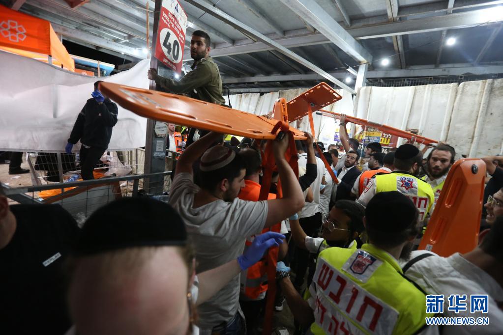 4月30日,救援人员和医护人员在以色列北部梅龙山发生踩踏事故的现场工作。据以色列媒体30日报道,当日凌晨该国北部发生一起严重踩踏事故,已致至少44人死亡,103人受伤,部分伤者情况危急。事发时大量犹太教徒聚集在该国北部的梅龙山庆祝犹太教节日,约10万人参加的音乐会看台倒塌导致惨剧发生。新华社/基尼图片社