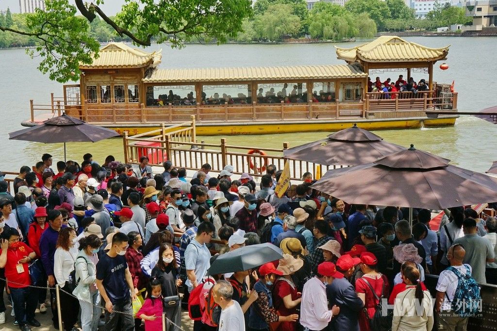 4月30日,浙江嘉兴南湖风景区湖心岛,来自全国各地游客来到党的诞生地瞻仰南湖红船。 随着五一节国际劳动节到来,嘉兴南湖风景区日接待游客量持续攀升,尤其是建党百年庆临近,预计五一长假期,“红色游”将突破历史新高。(供图:东方IC)