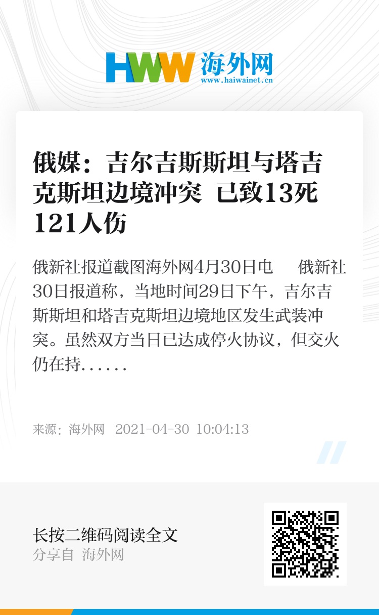海外网4月30日电 俄新社30日报道称,当地时间29日下午,吉尔吉斯斯坦和塔吉克斯坦边境地区发生武装冲突。虽然双方当日已达成停火协议,但交火仍在持续,已造成13人死亡、121人受伤。