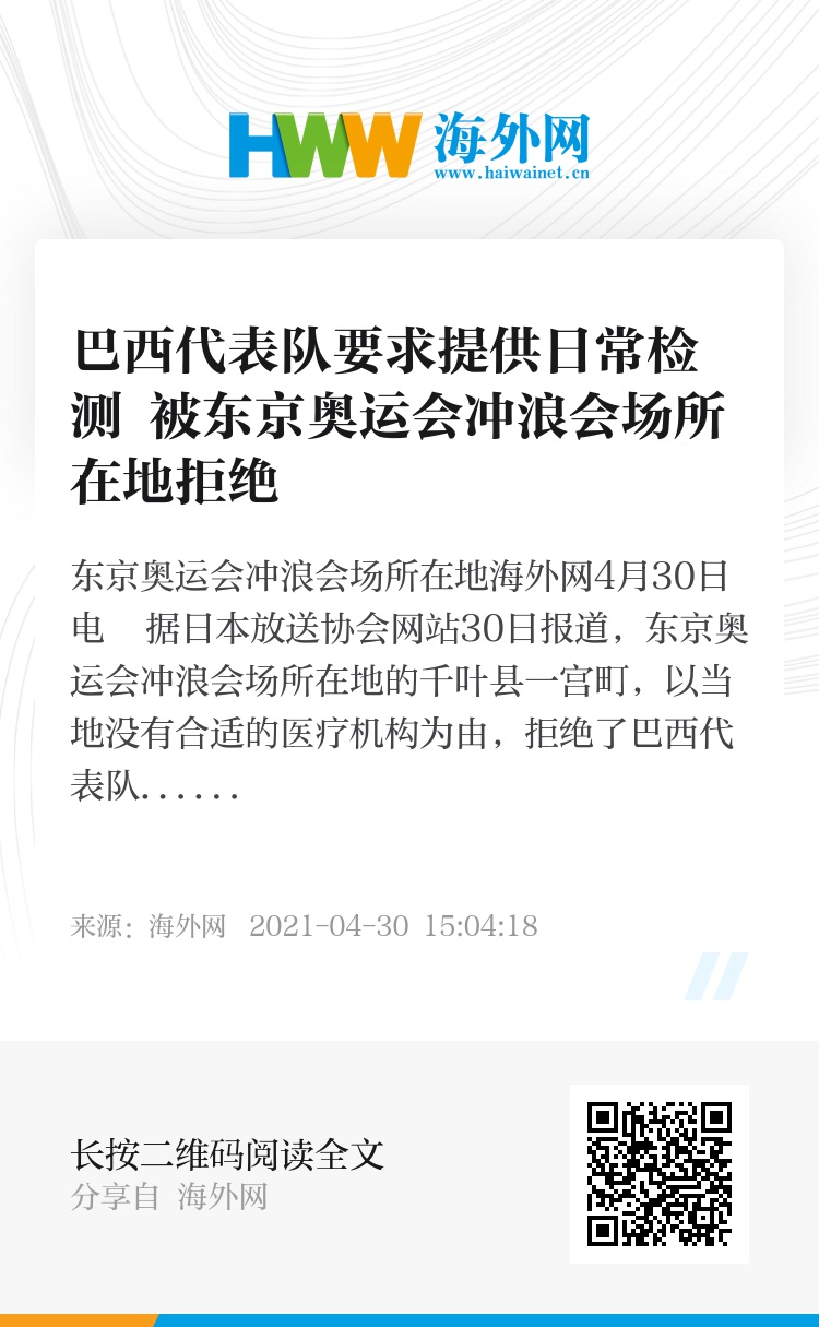海外网4月30日电 据日本放送协会网站30日报道,东京奥运会冲浪会场所在地的千叶县一宫町,以当地没有合适的医疗机构为由,拒绝了巴西代表队在当地住宿并每天接受新冠病毒检测的请求。