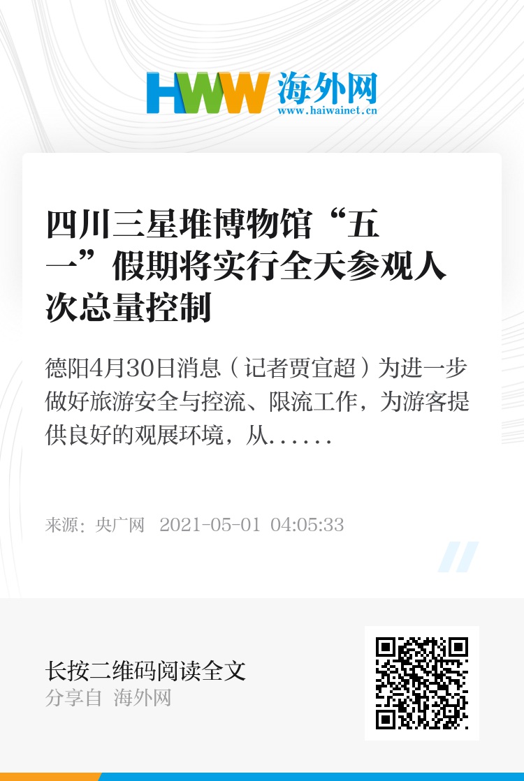 央广网德阳4月30日消息(记者贾宜超)为进一步做好旅游安全与控流、限流工作,为游客提供良好的观展环境,从4月25日起,四川广汉三星堆博物馆实行全天参观人次总量控制与提前网上实名购票。