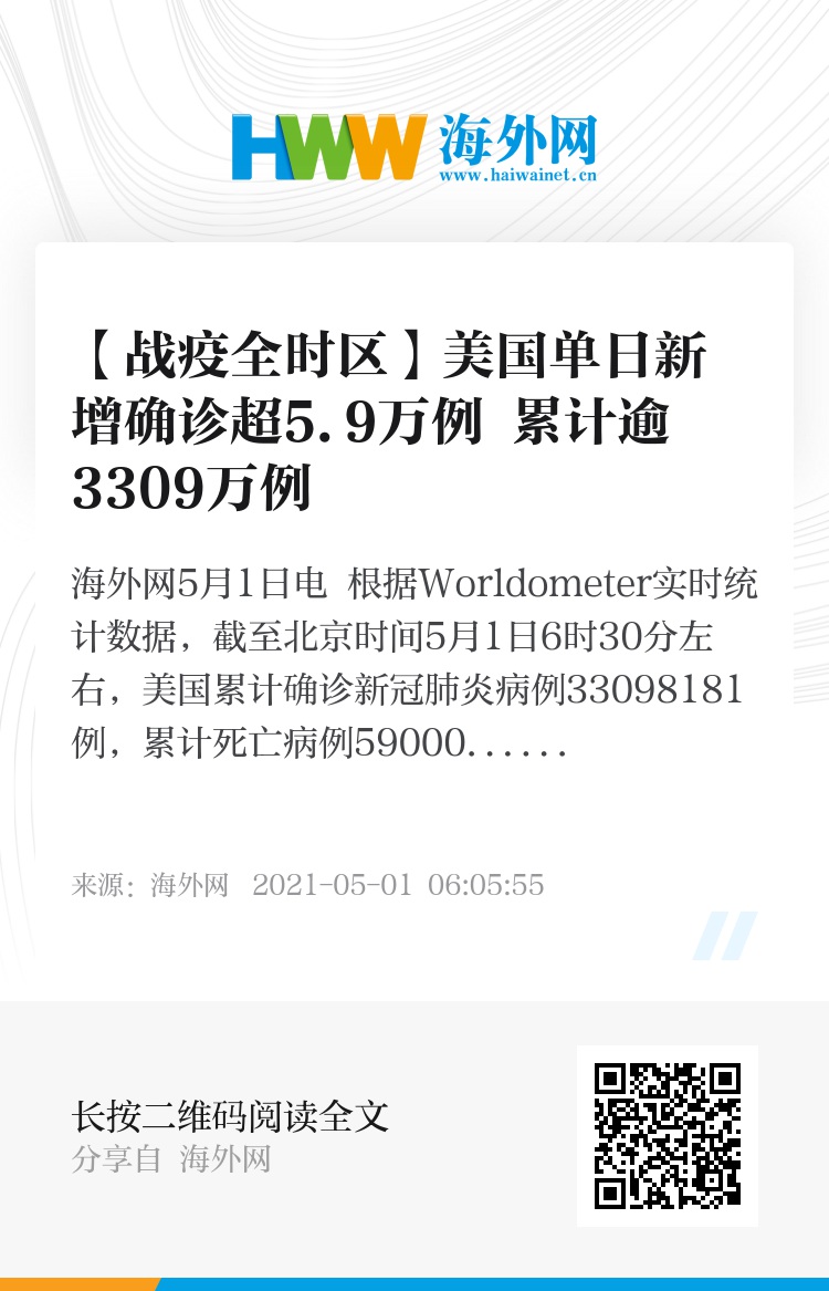 海外网5月1日电 根据Worldometer实时统计数据,截至北京时间5月1日6时30分左右,美国累计确诊新冠肺炎病例33098181例,累计死亡病例590001例。与前一日6时30分数据相比,美国新增确诊病例59867例,新增死亡病例850例。(海外网 李萌)
