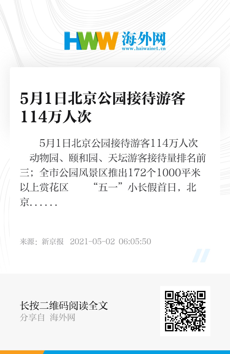 新京报讯 记者从北京市园林绿化局了解到,“五一”小长假首日,全市公园共接待游客114万人次,各公园实行严格的疫情防控和客流管控措施。