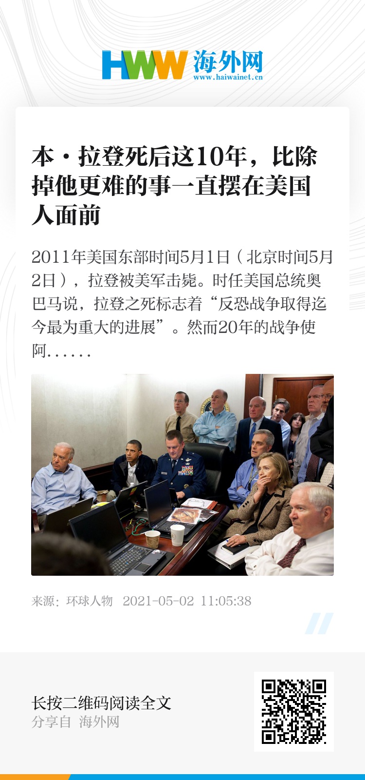2011年美国东部时间5月1日(北京时间5月2日),拉登被美军击毙。时任美国总统奥巴马说,拉登之死标志着“反恐战争取得迄今最为重大的进展”。然而20年的战争使阿富汗深陷乱局,如今拜登号称要 “无条件” 撤军,或留下中东“烂摊子”。