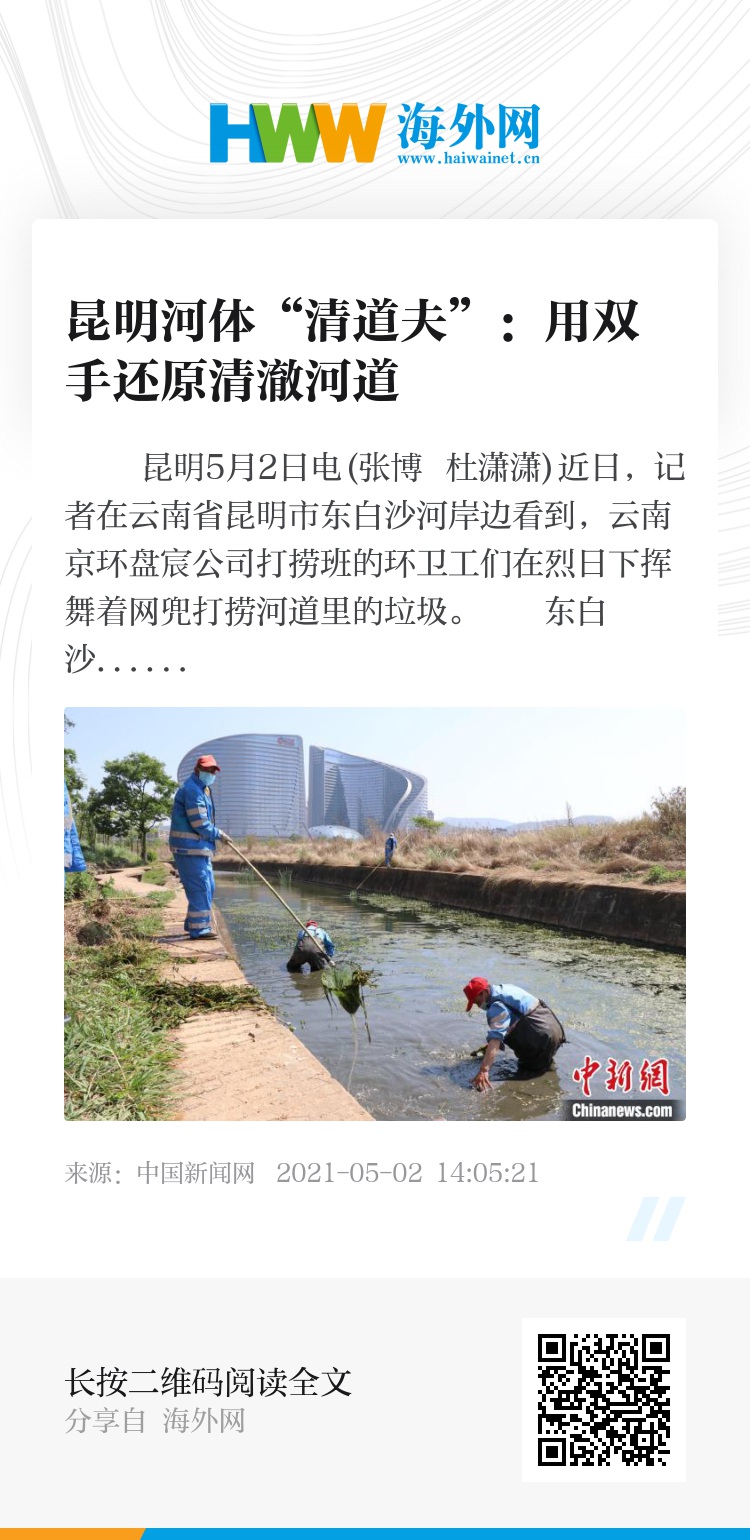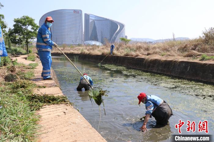 中新网昆明5月2日电(张博 杜潇潇)近日,记者在云南省昆明市东白沙河岸边看到,云南京环盘宸公司打捞班的环卫工们在烈日下挥舞着网兜打捞河道里的垃圾。