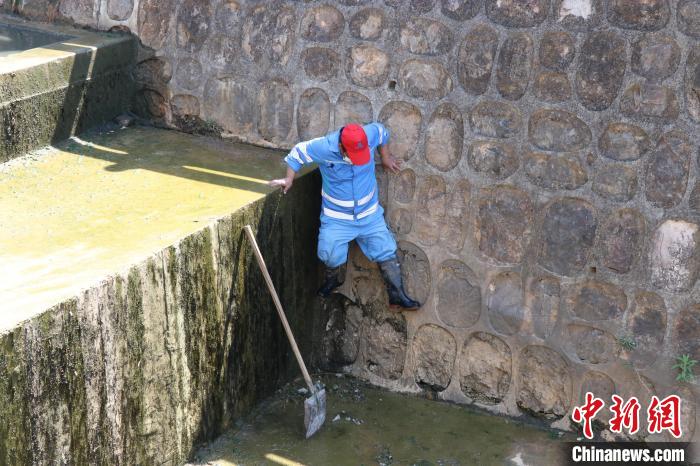 有的河道落差很大,只见陈祖祥掌握了“飞檐走壁”的功夫,借着河岸堤坝的些许凹凸,靠着手掌的摩擦力,一脚踩着墙体顺势一蹬,一脚拉开步子跨步向下,便麻利地下到了足足有一米多高落差的台阶。