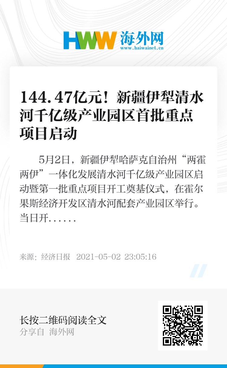 5月2日,新疆伊犁哈萨克自治州“两霍两伊”一体化发展清水河千亿级产业园区启动暨第一批重点项目开工奠基仪式,在霍尔果斯经济开发区清水河配套产业园区举行。当日开工项目共33个,总投资144.47亿元,其中投资10亿以上的项目5个,10亿元以下的项目28个。