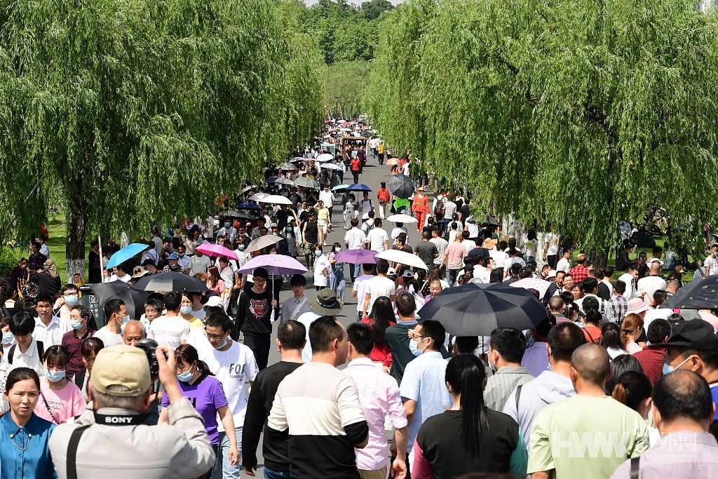 5月1日,五一小长假首日,杭州天气晴好,气温直线上升。西湖景区,也迎来了第一波旅游高峰。天气虽热,但游客或在人群中看风景,或泛舟湖上,“热情”丝毫不减。(供图:视觉中国)
