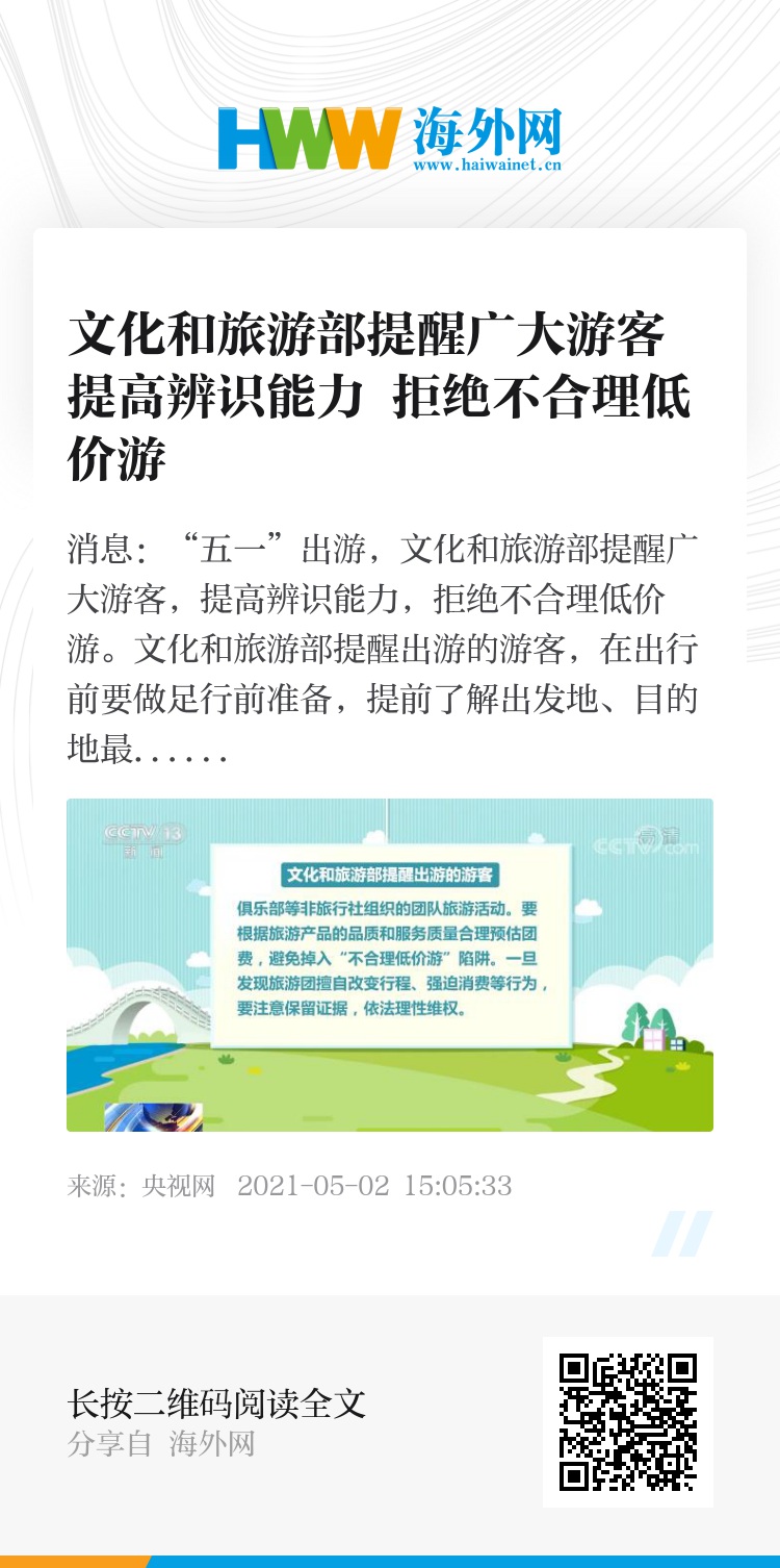 央视网消息:“五一”出游,文化和旅游部提醒广大游客,提高辨识能力,拒绝不合理低价游。
