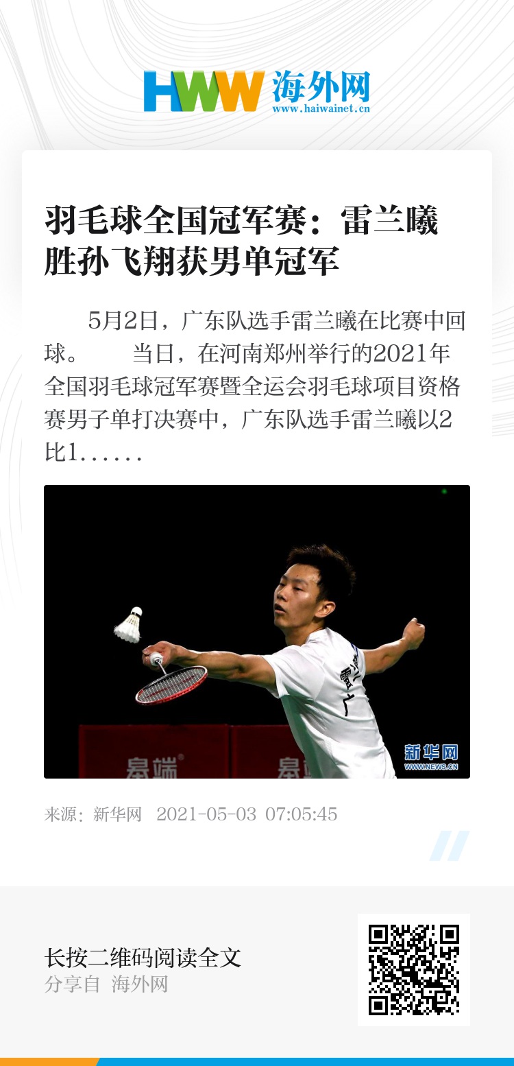 当日,在河南郑州举行的2021年全国羽毛球冠军赛暨全运会羽毛球项目资格赛男子单打决赛中,广东队选手雷兰曦以2比1战胜湖北队选手孙飞翔,获得冠军。